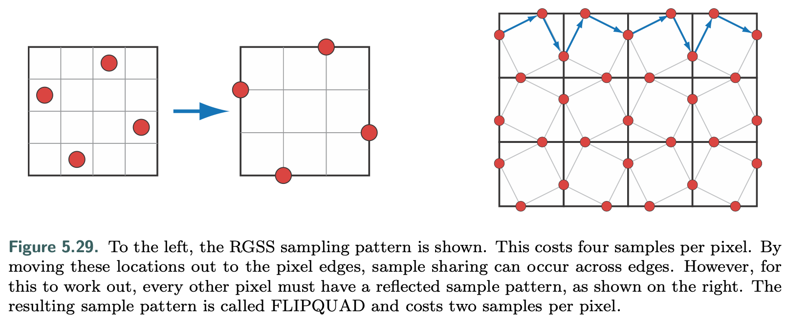 When used in a single frame, Quincunx has a low cost of only two samples by sharing samples at the pixel boundaries. The RGSS pattern is better at capturing more gradations of nearly horizontal and vertical edges. First developed for mobile graphics, the FLIPQUAD pattern combines both of these desirable features. Its advantages are that the cost is only two samples per pixel, and the quality is similar to RGSS (which costs four samples per pixel).