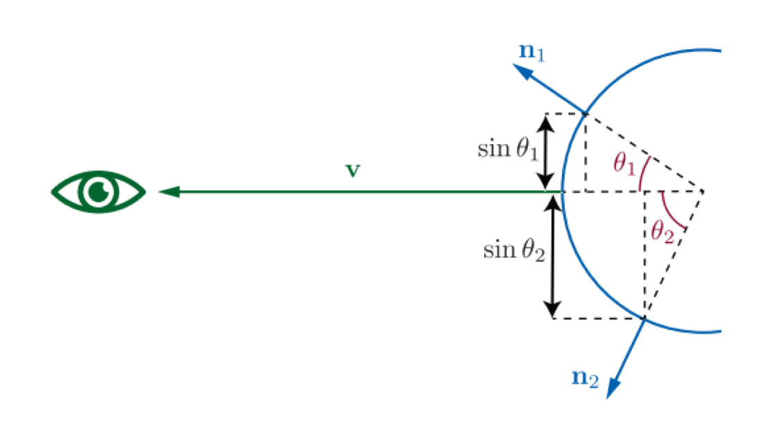 Figure 9.21. Surfaces tilted away from the eye are foreshortened. This foreshortening is consistent with projecting surface points according to the sine of the angle between $v$ and $n$ (for mirror reflection this is the same as the incidence angle). For this reason, Fresnel reflectance is plotted against the sine of the incidence angle in Figures 9.20 and 9.22.
