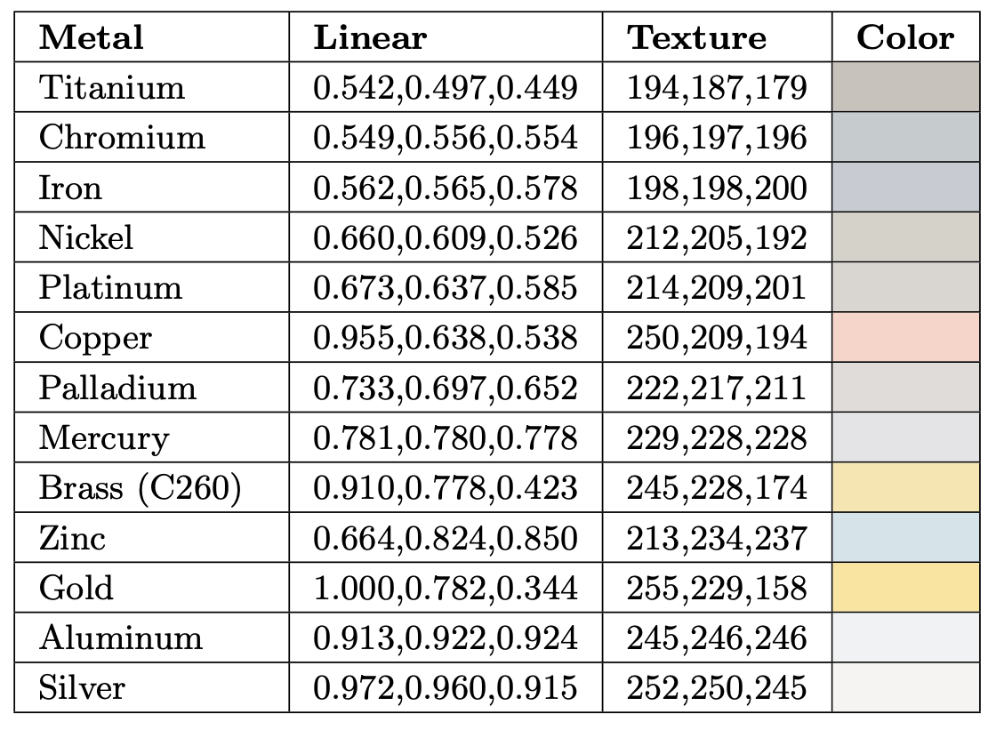Table 9.2. Values of $F_0$ for external reflection from various metals (and one alloy), sorted in order of increasing lightness. The actual red value for gold is slightly outside the sRGB gamut. The value shown is after clamping.